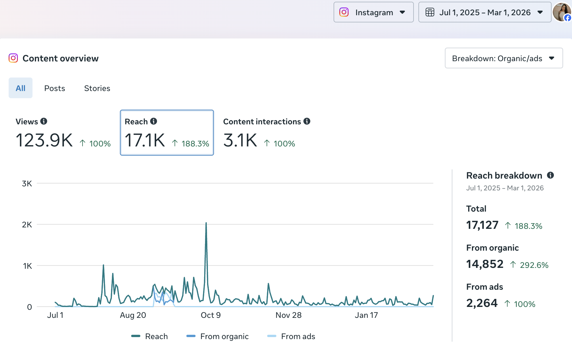 Screenshot of actual Meta Business Suite data from July 1st, 2025 - March 1, 2026 - the timeframe in which we managed their socials and website.